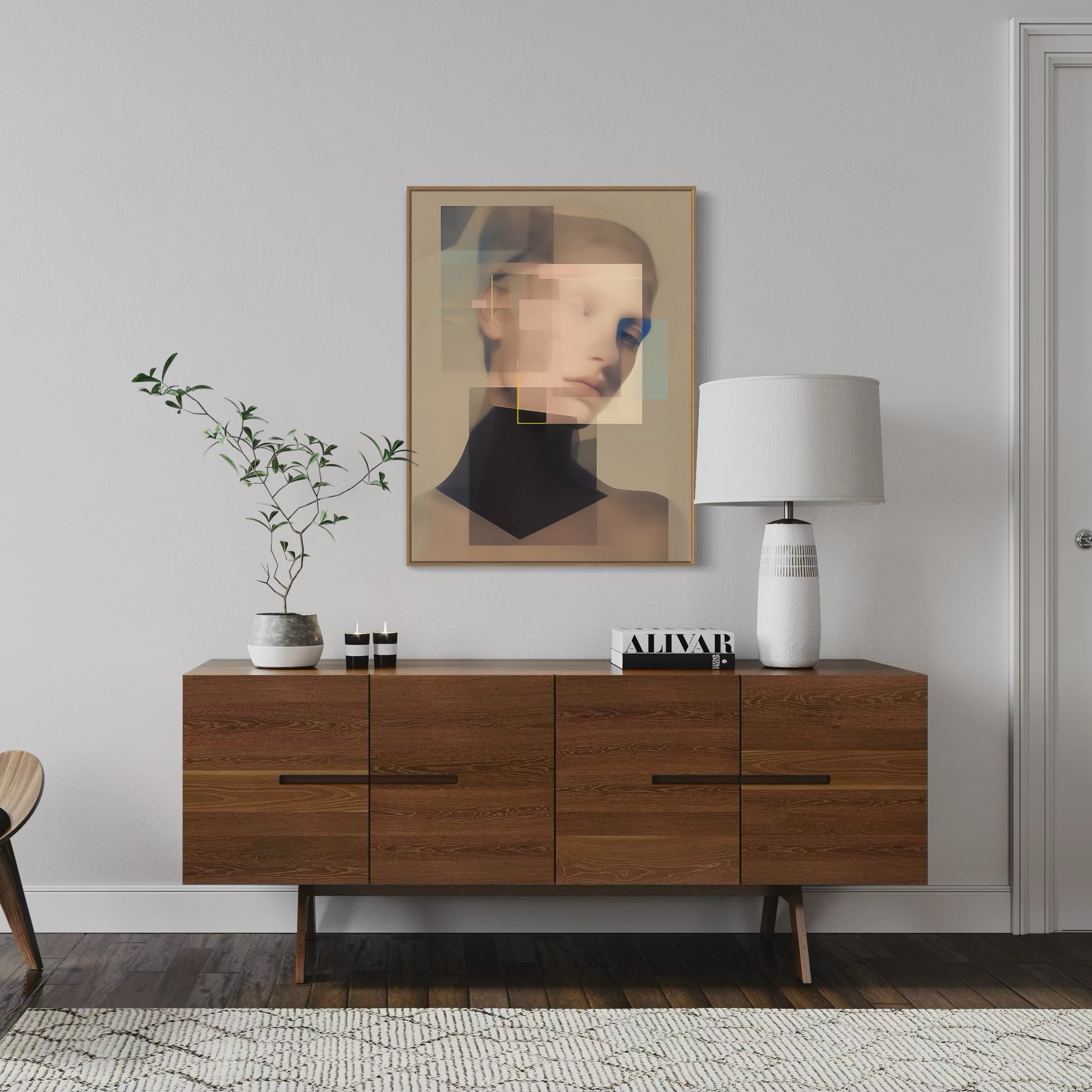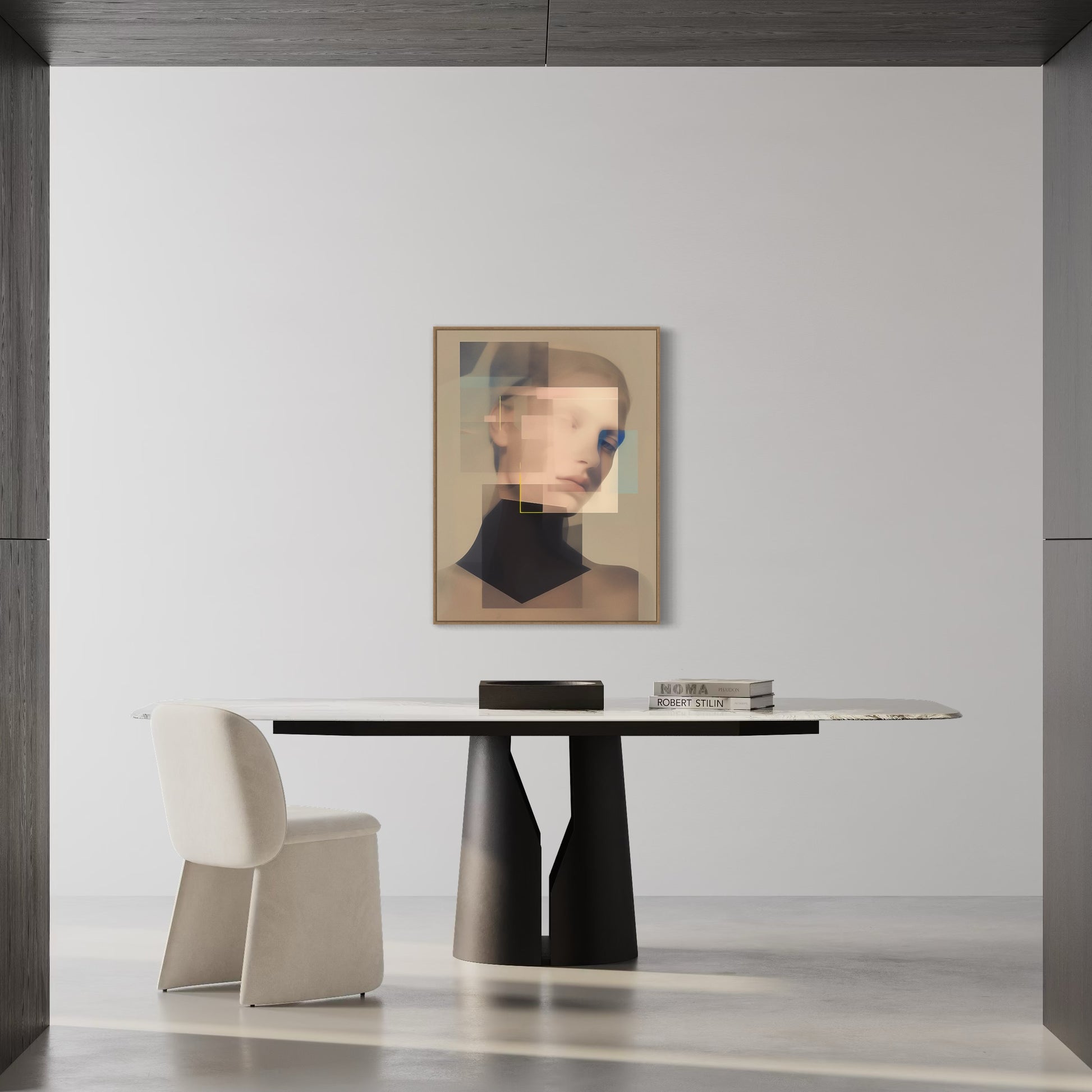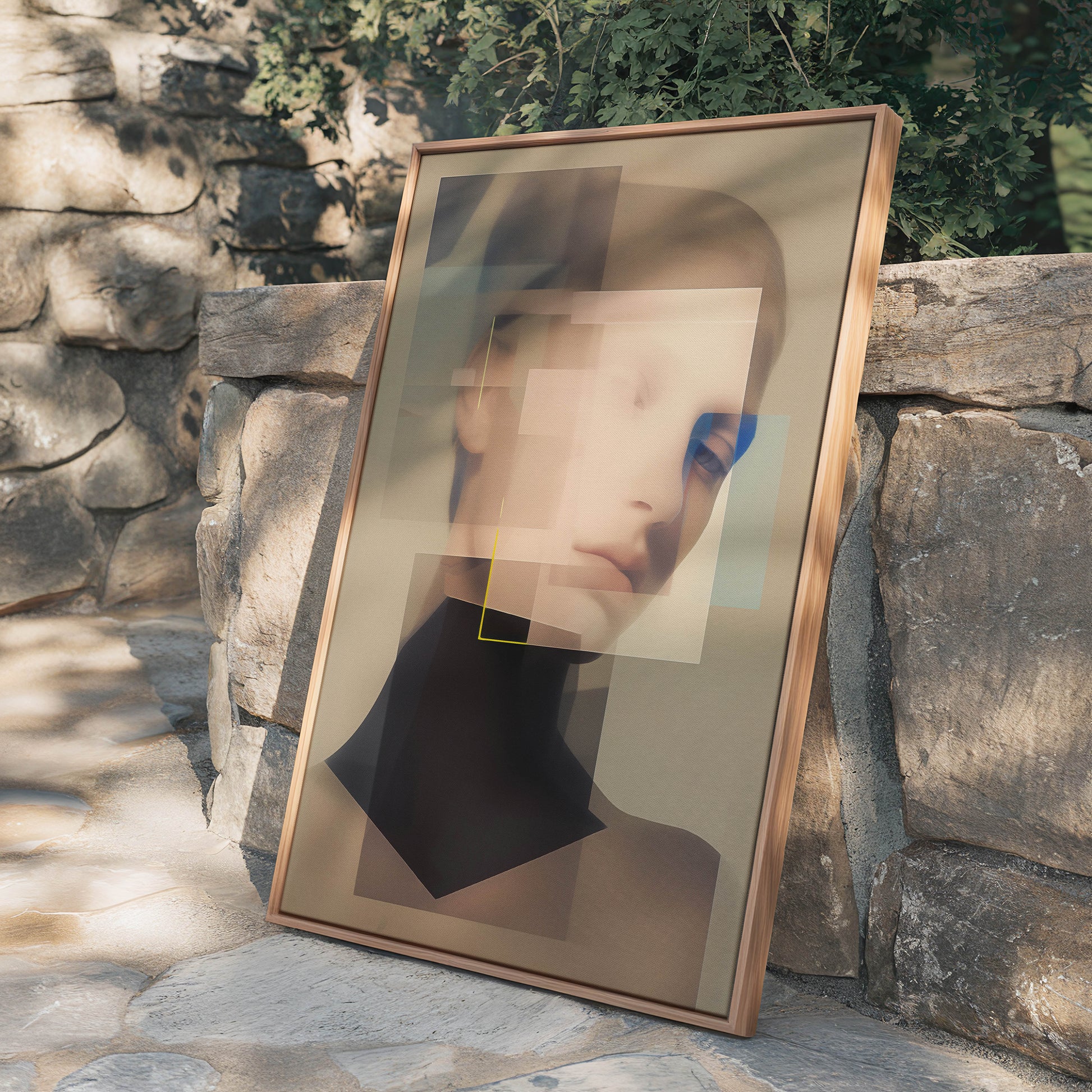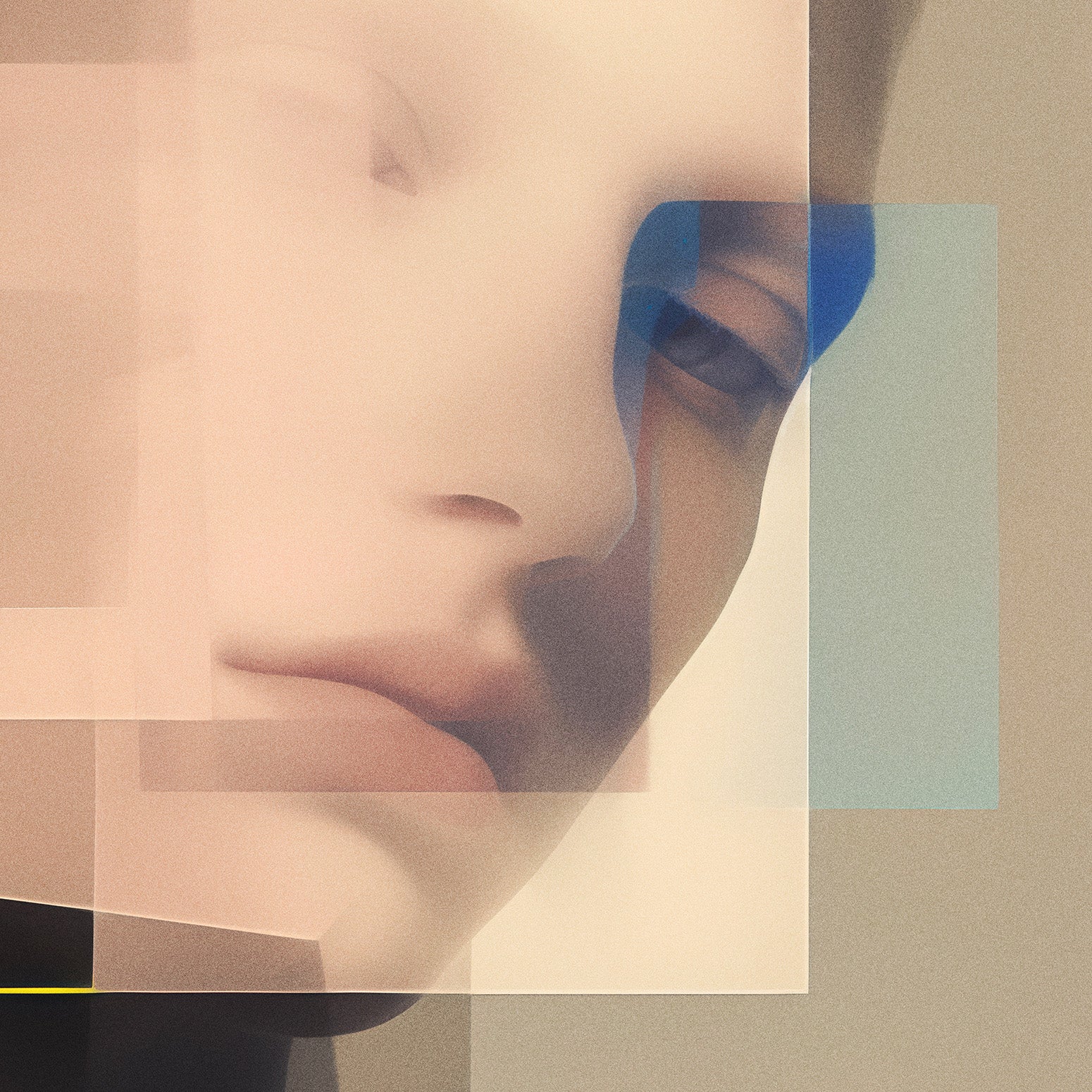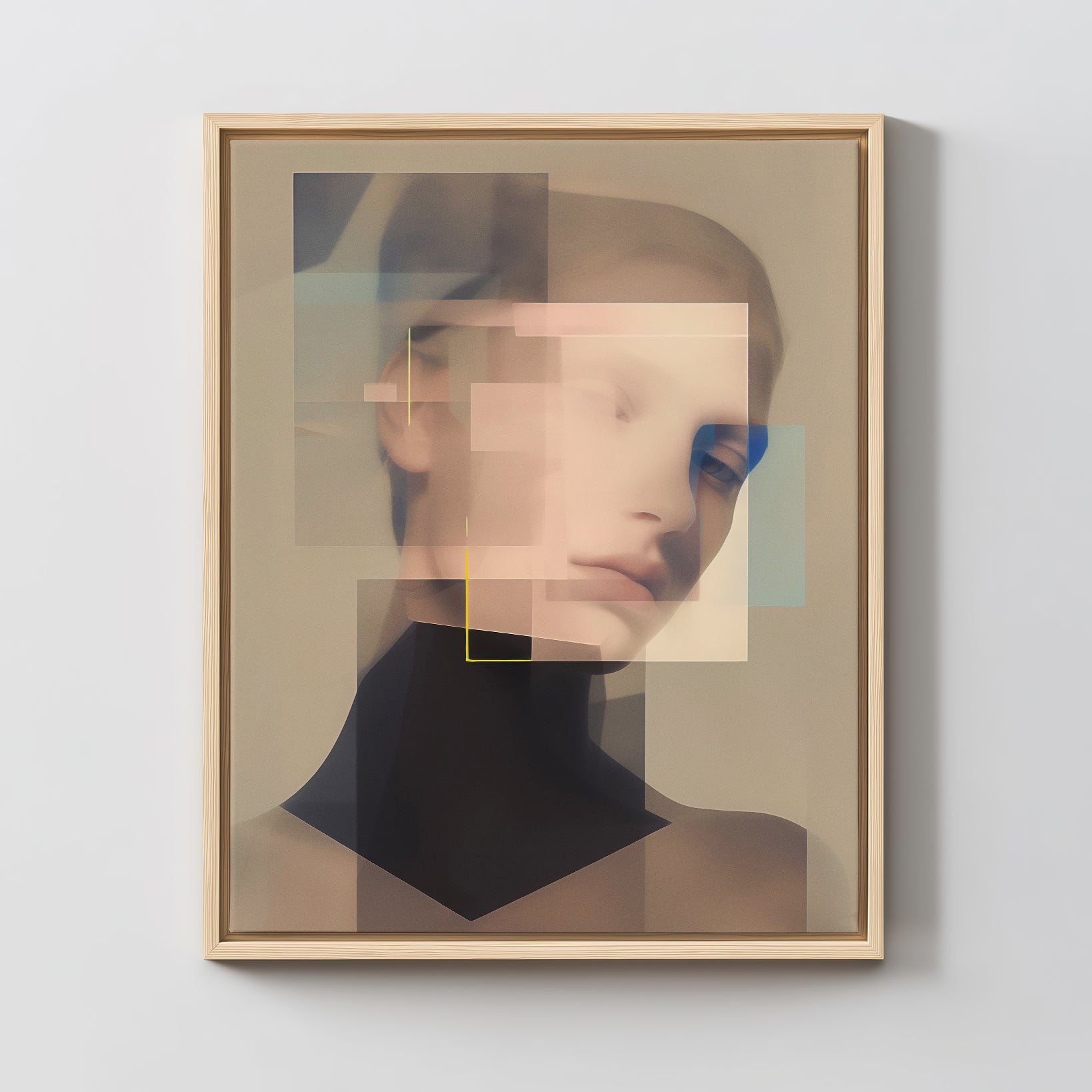 Zwischen Fläche und Fragment, Linie und Leere, entfalten sich Gesichter, die mehr verbergen als zeigen. In ihren melancholischen Blicken liegt eine stille Spannung - eine Sehnsucht, die nicht laut wird, sondern sich in geometrischen Umrissen verliert. Überlagerung, Transparenz, ein Öffnen des Raumes. Fragile Momente, eingefroren im Spiel von Form und Gefühl. Diese Serie ist eine Suche: nach Identität, nach Nähe, nach dem, was zwischen den Konturen bleibt.